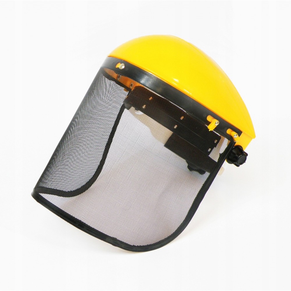 Osłona twarzy składająca się z siatki, ramki i nagłowia.