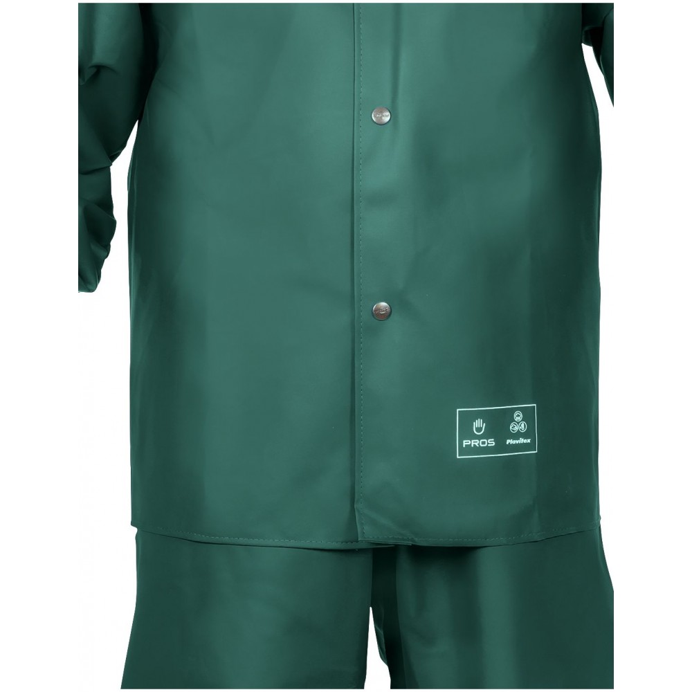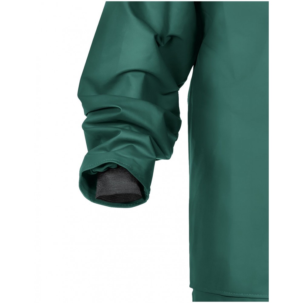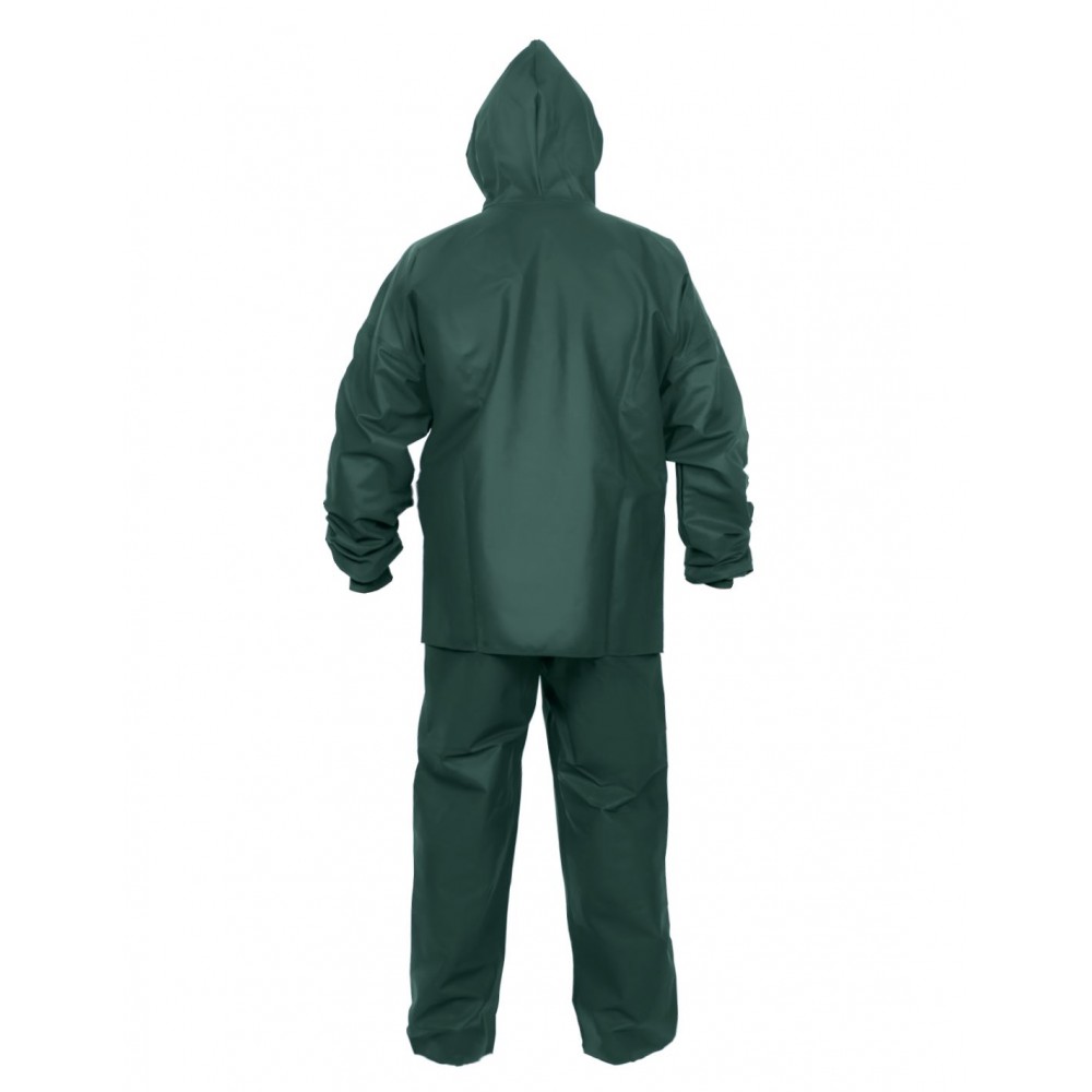 Ubranie składające się z kurtki o długości ¾ oraz wygodnych spodni ogrodniczek, niezastąpione w pracy w trudnych warunkach pogodowych. Kurtka zaopatrzona w funkcjonalny, regulowany kaptur. Wiatrołapy w rękawach zapobiegają dostawaniu się wody do wnętrza. Spodnie z regulowanymi szelkami z szeroką gumą z tyłu. Ubranie wykonane techniką obustronnego zgrzewania, co skutecznie zwiększa wytrzymałość szwów.