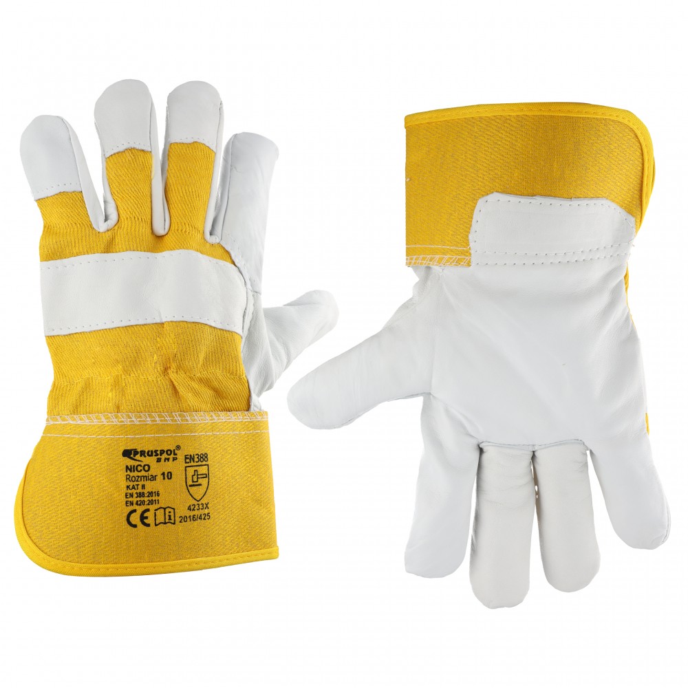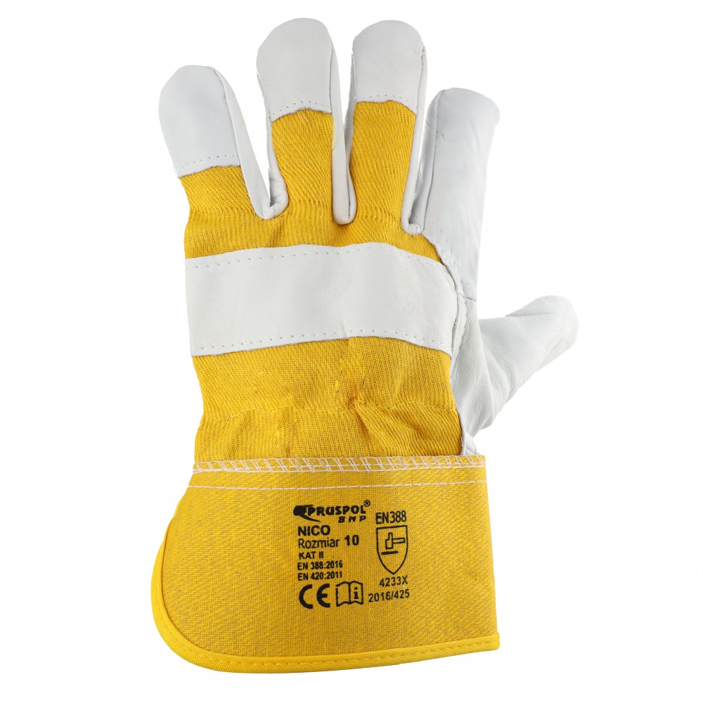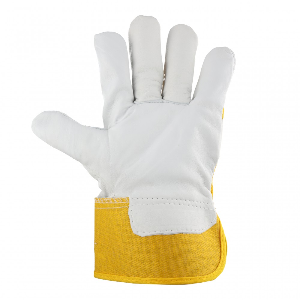 Rękawice robocze, ochronne, wykonane w całości z wysokiej jakości skóry koziej, licowej. Całodłonicowe w jasnym kolorze, zakończone ściągaczem podgumowanym ze sztywnym mankietem w kolorze żółtym.