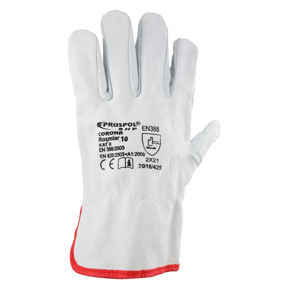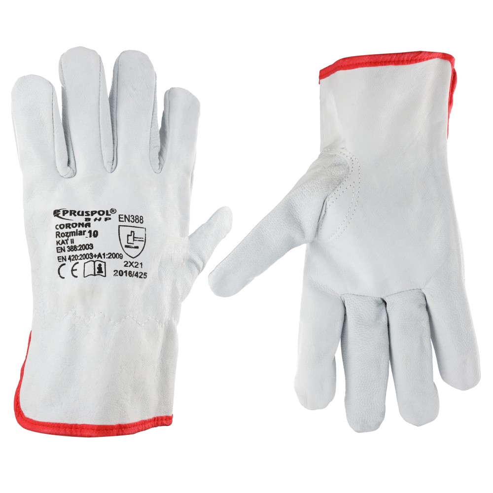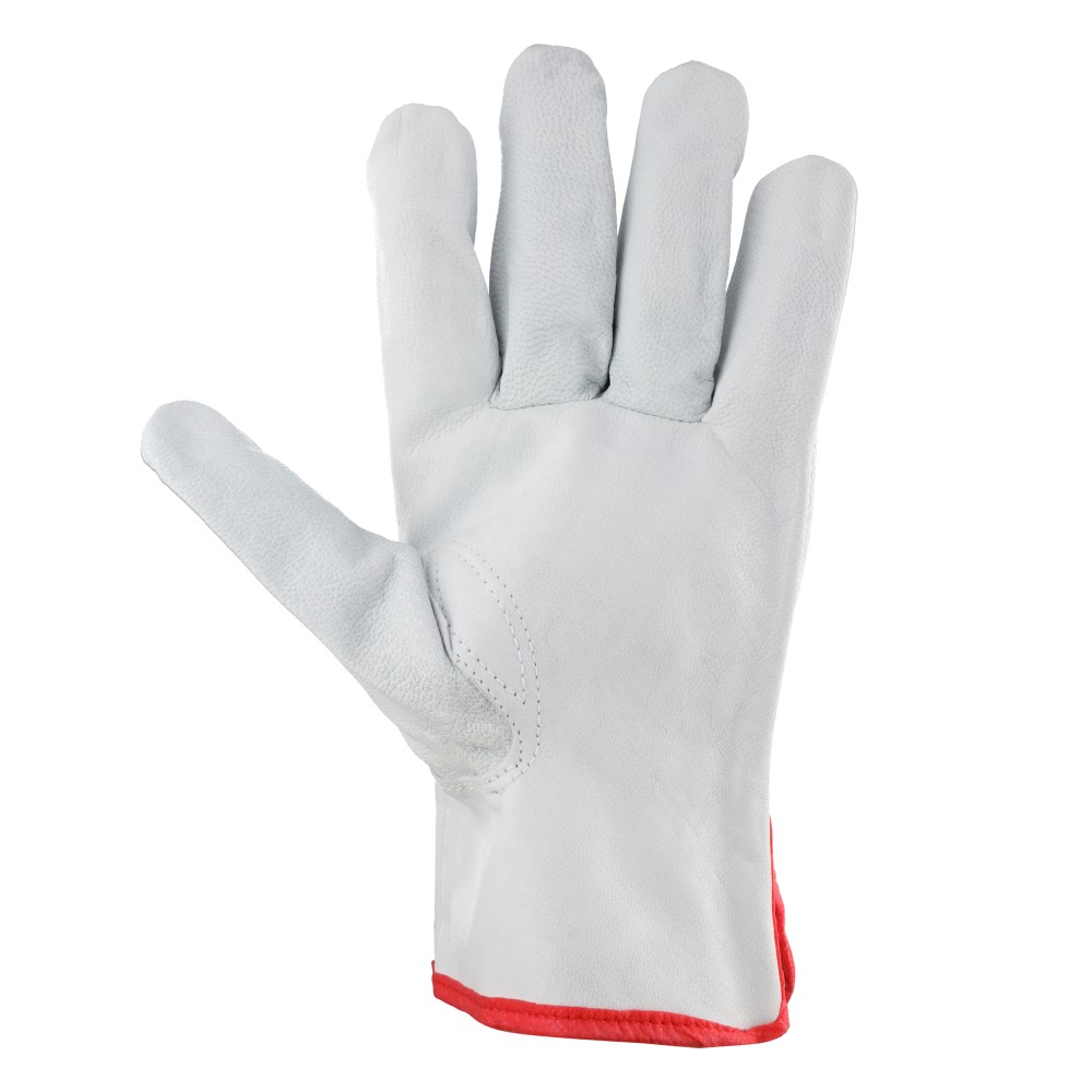 Rękawice robocze, ochronne, wykonane w całości z wysokiej jakości skóry koziej, licowej. Całodłonicowe, w kolorze jasnym, marszczone w nadgarstku.